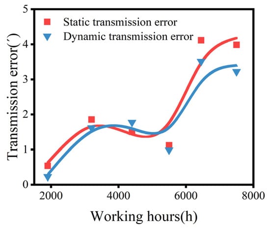 Figure 18 depicts the rigid body’s STE and DTE. The STE initially increased with time, occasionally experiencing slight decreases, but ultimately continued to increase. The largest value reached 4.11′ at a working time of 6450 h. In addition, the DTE under sinusoidal load reached the largest value of 3.51′ at a working time of 6450 h. Although both exhibited a two-stage degradation process, the average value of the DTE was lower, likely because the gap was compensated with the load. Furthermore, the DTE fluctuated more as the load was unstable.