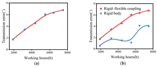 To build a more accurate model of the RV reducer, the cycloid gear was regarded as a flexible body. The TE is presented in Figure 19a, and the largest value reached 6.77′ at a working time of 7500 h. Figure 19b compares the STEs of the rigid model and the rigid–flexible coupling model. It was found that even though the two have a similar trend, the TE increased with the growth of working time in general. But, under the rigid–flexible coupling model, the TE did not exhibit a two-stage degradation process. And the largest value reached 6.77′. Upon analysis, the rigid body model only considered the motion equations of the components, reflecting the movement relationships between them. Conversely, the rigid–flexible coupling model accounted for the elastic deformation and internal stress distribution of the components and could, therefore, more precisely simulate the interactions between contact surfaces. The computer runtime for the rigid body and rigid–flexible coupling model was 0 h 12 m 52 s and 1 h 56 m 33 s, respectively, based on the hardware (Intel core I5 12,400 CPU, DDR4 16G RAM) and software (ADAMS VIEW 2020).