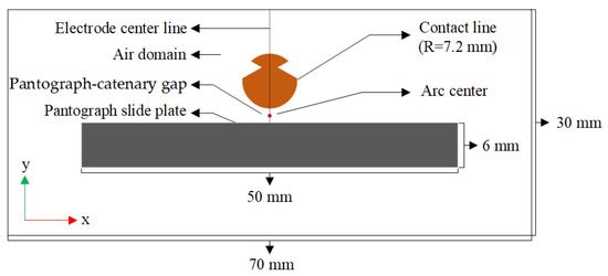 A two-dimensional simplified geometric model of the pantograph-catenary system along the direction of the train is shown in Figure 1. The cross-section of the pantograph slide plate along the direction of the train is a regular rectangle, and the surface in contact with the discharge gap is equivalent to a line segment. The cross-section of the contact line shows an arc shape with two longitudinal grooves, and it is the lower arc-shaped surface that is mainly involved in contact, so the geometric model of the contact surface is equivalent to a semicircle. The geometric size of the contact line is consistent with the actual size, and the radius of the bottom arc is 7.2 mm. The straight line passing through the center of the upper surface of the pantograph slide plate and the center of the surface below the contact line is defined as the electrode center line, and the abscissa of the points on the line is 0 mm. The center between the two electrode surfaces is defined as the arc center.