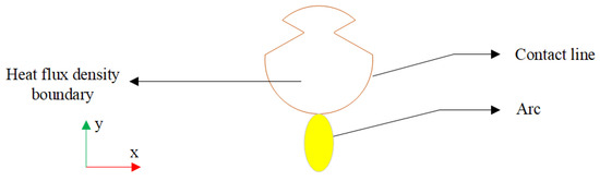Since this section only studies the ablation characteristics of the contact line, only a two-dimensional simplified geometric model of the contact line along the direction of the train is drawn up. The lower bottom of the contact line that is directly affected by the arc is set as the heat flux density boundary. All the boundaries of the contact line are supplemented with the boundary conditions for convective heat transfer and surface radiation heat transfer to the environment. The two-dimensional simplified geometric model is shown in Figure 2.