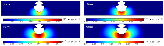 In order to facilitate the observation, this section draws a local view of the contact line containing the molten pool, as shown in Figure 6. According to Figure 6, under the action of the pantograph-catenary arc, the temperature of the contact line reaches the melting point of the material and melts to form a molten pool. From arcing at 2 ms to 10 ms, the overall molten pool of the contact line shows an arc shape with an expanding size.