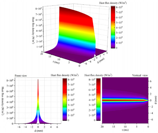 It can be seen from Figure 4 that the main distribution trend of the heat flux density injected into the contact line is that it decreases with the increase in the distance d from the central line of the electrode, and its overall distribution shows an approximate Gaussian distribution [23]. In addition, it can be seen from the figure that the heat flux density increases significantly with the increase in arcing time t. This is because the increase in arcing time means that the high-temperature region of the arc expands to both sides and the maximum temperature of the arc increases accordingly. Therefore, the heat flux density injected into the contact line increases with the increase in arcing time.