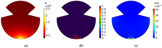 The distribution of temperature, the molten pool, and molten pool velocity inside the contact line material: (a) the distribution of temperature inside the contact line; (b) the distribution of the molten pool inside the contact line; (c) the distribution of the molten pool velocity inside the contact line.