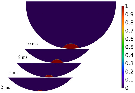 In the actual train operation process, the pantograph-catenary arc will last for a certain period of time. The analysis of the temperature characteristics of the pantograph-catenary arc in Section 3.1.1 mentions that as the arcing time increases, the maximum temperature of the arc increases, and the high-temperature area expands. Therefore, it is necessary to study the distribution of the molten pool of the contact line under different arcing times to reflect the arc ablation characteristics of the contact line. Due to the poor convergence of the liquid phase rate distribution in the initial solution of the contact line ablation model, arcing times of 2 ms, 5 ms, 8 ms, and 10 ms are selected as the characteristic values for analysis.