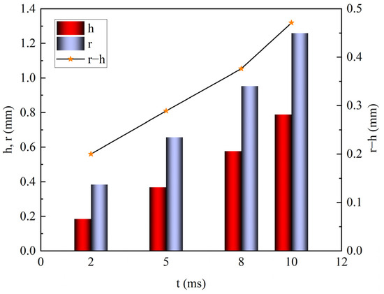 The relationship between the depth h and radius r of the molten pool and the arcing time t is obtained by counting the data in Figure 6, as shown in Figure 7.