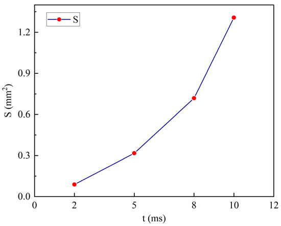 In the COMSOL Multiphysics software, the area where the liquid phase rate is greater than 0 is calculated by the integral method to obtain the molten pool area S under different arcing times, as shown in Figure 8.