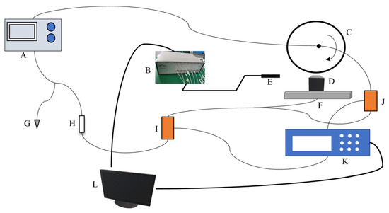Pantograph-catenary arc experimental platform diagram. A—High voltage power supply, B—Avantes spectrometer, C—contact line, D—pantograph carbon slider, E—fiber optic probe, F—displacement console, G—grounding, H—adjustable resistance, I—current acquisition, J—voltage acquisition, K—data collection, L—calculators.
