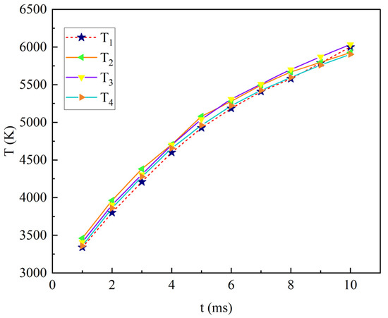In the first experiment, the arc temperature at the center point of the two electrodes after different arcing times, under the conditions of a current of 300 A and a pantograph-catenary gap of 4 mm, is obtained. In order to prevent experimental error, three iterations of temperature detection should be carried out on the arc center, following the same test steps. A comparison and analysis of the experimental results for T2, T3, and T4 with the simulation results T1 are shown in Figure 10.