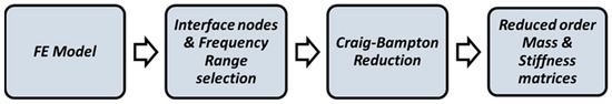 First, the FE models of all links must be created, so their elastic behavior under loading conditions, in addition to their natural frequencies and mode shapes can be considered. Following that, the reduction of the models can be performed using the Craig-Bampton (CB) method. The advantage of this method is that it includes both static and vibration modes to create a complete reduction basis and, subsequently, an appropriate representation of the subsystem’s dynamic behavior. Only vibration modes with natural frequencies in a selected frequency range from the user are retained to approximate the dynamics of the DOFs internal to the substructure, leaving behind only the DOFs at the interfaces, which in this case are connected to the adjacent links through rotational joints, and a certain number of internal DOFs related to the retained vibration modes in a clamped boundary configuration. After the CB method application, the reduced mass and stiffness matrices are obtained, which are known as Superelements in commercial FE packages and are being used to represent the dynamic behavior of flexible bodies [41]. The modeling procedure for the robot links is summarized in Figure 2 below.