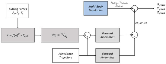 where is joint spring stiffness value of the joint in , while the minus sign has been omitted because for this model the deformation direction is defined from torque sign. After estimating all six angular deformations, the deformed cutting tool position can be calculated. Figure 3 summarizes the aforementioned procedure with a flowchart.