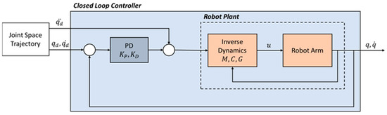 Robotic systems combine mechanical, electrical, and software parts to perform the commanded functions; as a result, the controller architecture has a significant impact on the manipulator performance and the applications it can accomplish. A joint space controller has been developed to further extend the robot multi-body model and lead to a more realistic digital representation of the real robot. In addition, a PD controller for every joint has been included to create a closed-loop control system. The architecture of the proposed controller is presented in Figure 4 below.