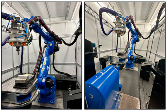 Machining is still a new application for robots, and, until now, their industrial adaptation is restricted to tasks with low cutting force requirements (e.g., drilling and polishing). However, their use for more challenging tasks, such as milling, is driven by the multiple advantages they present over conventional CNC machines. Specifically, robots offer larger working spaces at lower cost, providing an excellent base for cost-efficient machining, while flexibility is also added to the manufacturing system from the industrial robots’ incorporation, since they can execute different tasks with minor adjustments. Finally, due to their flexible kinematics, robots are capable of moving in tight areas and machine parts with complex geometries, without the need of any special techniques or fixtures [3,4]. Along with the introduction of robots to machining, the use of robots for hybrid manufacturing has also emerged. Hybrid manufacturing presents a high potential of surpassing conventional manufacturing technologies, being able to reduce production times, achieve the desirable geometric accuracy and surface characteristics, create multiple material parts, and repair damaged parts [5]. The use of robots for hybrid manufacturing is a much more flexible alternative compared to hybrid machine tools, reducing the challenges and complexities regarding equipment integration; as a result, it is highly pursued [6].