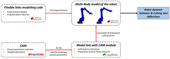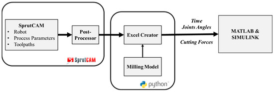 Finally, a Python software module dedicated to the interoperability between the simulation tool and the CAM software (SprutCAM X Robot v16) has been developed. This tool is responsible for the generation of an Excel file that contains the process joint angles and orthogonal cutting forces as a function of time, which serves as an input for the Simulink MBS, after having fully designed the process in the SprutCAM environment (robot and cutting tool geometry, toolpaths, and process parameters). The implementation workflow for the link between the MBS and SprutCAM is presented in Figure 8.