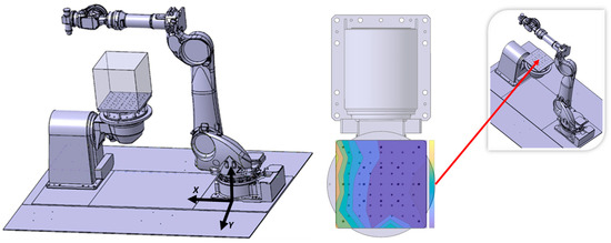 Robot’s workspace area for which the stiffness maps were generated and base axis system (blue color in the colormap corresponds to low stiffness value and yellow to high values).
