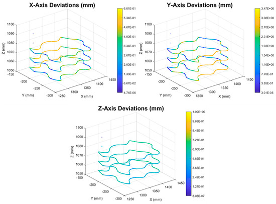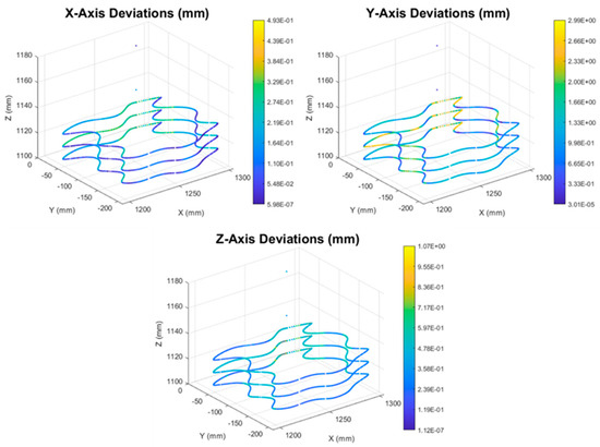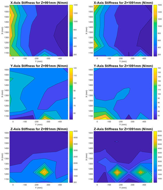 where , , and are the robot deflections to the correspondent axis from the initial position during the static simulations. Some of the generated stiffness maps are presented in Figure 10 below, while it is noted that all the coordinate values are measured from the robot base system, and all the simulations have been performed for robot poses that the cutting tool axis is aligned with the robot axis. It is evident that with the approach followed for the stiffness map generation, the kinematic redundancy of the robot is not taken into account. As such, this tool is not suitable for robot pose optimization applications, but only for selection of the optimal workpiece placement position when machining parts with the aforementioned configuration.