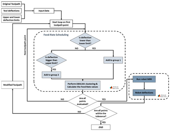 An offline feed-rate scheduling method based on a set of precalculated cutting tool deviations along a milling toolpath has been developed using Matlab environment. The algorithm calculates an optimized feed-rate profile for the process, in order to fulfill the user-predefined tolerance requirements, while not sacrificing process productivity. This work is backed up by the Altintas model [48], according to which by lowering the feed rate and lower generated cutting forces can be achieved, due to their linear relationship, which is visible from Equation (14). Lower cutting forces lead to smaller cutting tool positional errors, due to robot limited stiffness. The developed algorithm first performs a two-stage clustering procedure to the toolpath points based on their calculated position deflections and their Cartesian position, to generate regions along the toolpath with similar deflection values, whose feed-rate values must subsequently be modified in a similar way. For points with positional error greater than a user-defined upper limit, the feed rate will be decreased, while for points with error values below a desired lower limit, the feed rate will be increased, in order to enable higher productivity when the accuracy of the part is not that critical. The flowchart of the feed-rate scheduling algorithm is presented in detail in Figure 11 below.