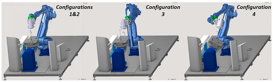 The aforementioned robot configurations are presented in Figure 18, while the cutting parameters for each of the 23 total milling experiments can be found in Table 5. All process parameters values (feed per tooth, cutting speed, axial and radial depths of cut) were selected based on the working parameters window provided by the cutting tool manufacturer. There was no specific design of experiments methodology (e.g., factorial, Taguchi) selected for the identification of process parameter combinations, as the point of these experimental tests was just to compare the results against the simulation and not do any further statistical analysis afterwards.