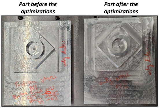 A first test part has been machined using an arbitrary placement position, and its dimensions have been measured. Afterwards, the optimization algorithms were applied and a part has been manufactured again, to prove the part accuracy improvement after their application. Figure 20 presents the setup of the machining experiments before and after the application of the optimization algorithms.