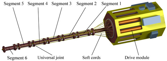 The structure diagram of the snake robot is illustrated in Figure 1. It consists of six equal segments, connected in series with universal joints between each segment. Each segment is restrained from each other by a universal joint. A motor mounted at the end drives three soft cords for robot attitude control. The snake robot contains six universal joints. Each universal joint has 2 degrees of freedom, so the total number of degrees of freedom of the mechanism is 12. The robot’s end effector is connected to the sixth segment by means of a universal joint. The end effector is directly connected to the gluing unit.