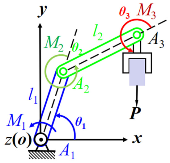 To illustrate this method, we first give a case study. Figure 4 illustrates a planar robotic grasper. The external load is P acting on the end effector. We need to analyze the individual joint torques , , and required to balance the external load.