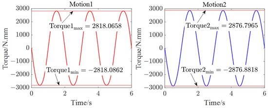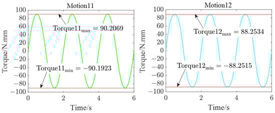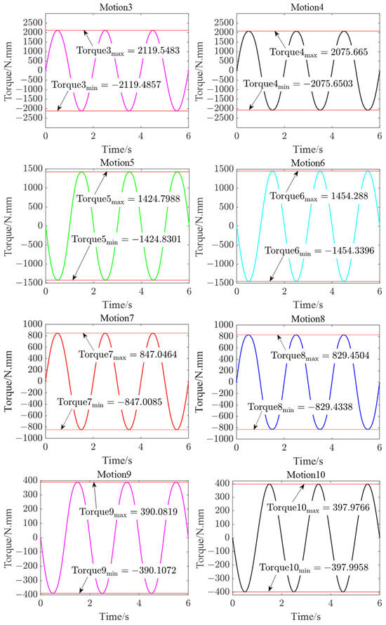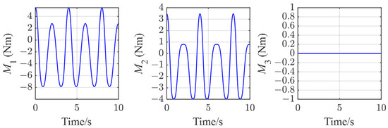 At this time, the twist matrix is substituted into Equation (17) and the torque of each joint at time t = 0 can be obtained. Then, through numerical iteration, the twist matrix at is updated. Substituting into Equation (16) and after iteration, the curve of the input torques of the motors in a period can be calculated. By programming the algorithm, the input torque curve (see Figure 5) of each joint was plotted.