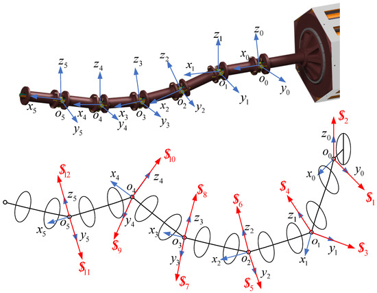 For the sake of simplicity, we decompose each universal joint into two orthogonal rotational joints and establish an absolute coordinate system on the base. We establish a joint coordinate system at the center of each rotational joint so that the axis of the joint coordinate system points in the direction of the angular displacement of the rotational joint. The redundant snake robot involves 12 screws, namely . The coordinate systems and screws are shown in Figure 6.