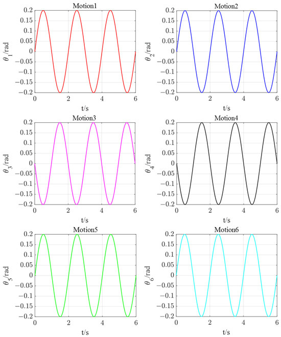 Sine waves are provided in Table 3 as a function of motion for each joint. The sine wave is one of the most fundamental waveform contours. In practical applications, other more complex waveforms can be obtained by using the Fourier transform. Therefore, other waveform movements can be seen as the superposition of multiple sine waveform functions.