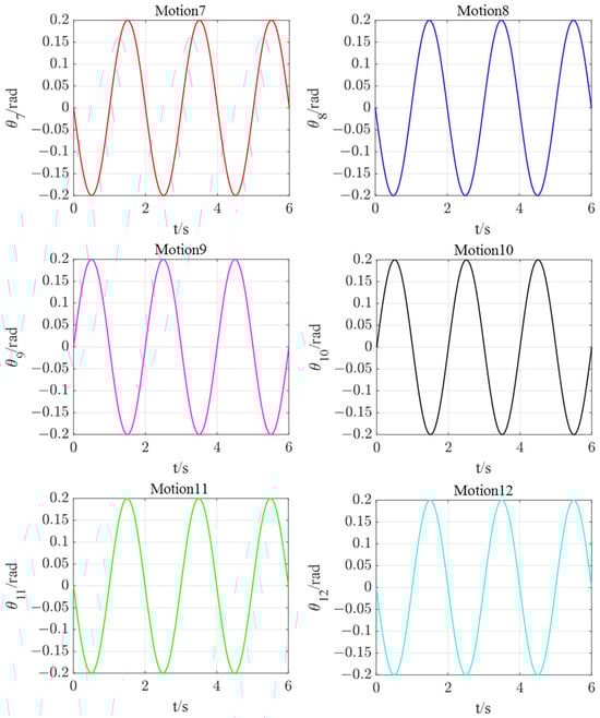 Hence, the driving torques of the redundant snake robot can be obtained directly. Assuming that the robot does quasi-static motion according to the joint angle function shown in Table 3, the joint torques can be obtained and plotted in Figure 9, where curves 1–12 correspond to the torques of these 12 motors, respectively. The calculation time 6 s can show that the driving function is also a trigonometric curve with periodic reciprocation. The amplitude of the driving moment gradually decreases as it approaches the end position. The inertial parameters of the robot are provided in Table 4.