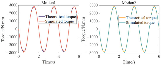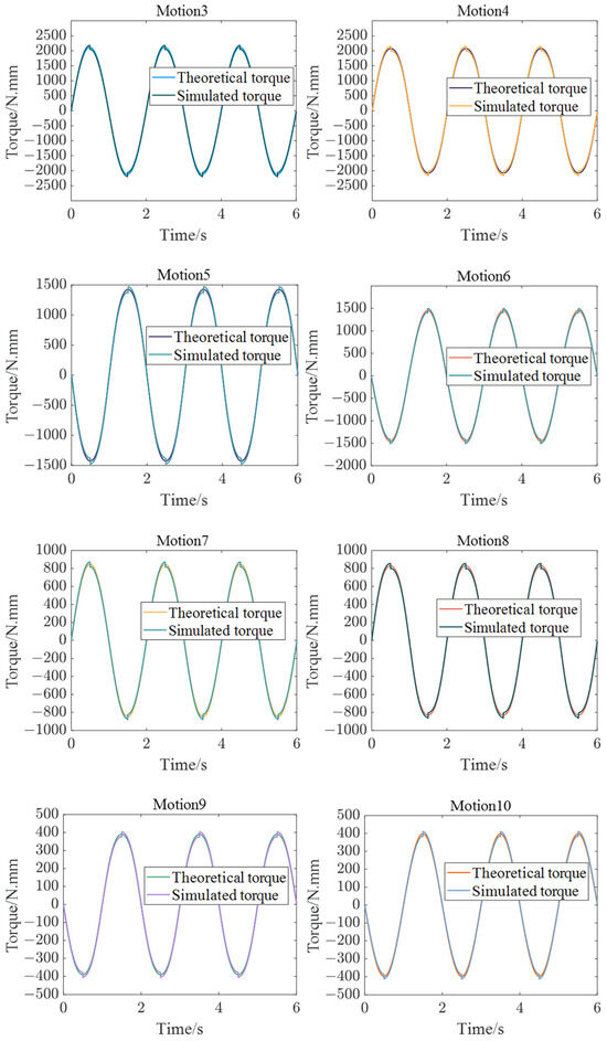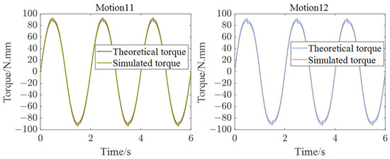 From Figure 11, it can be seen that the theoretical calculation curve is basically consistent with the simulation, which validates the theoretical method. However, there is a slight difference in amplitude between these two results, which is mainly due to two reasons. On the one hand, the parameters of the robot linkage in theoretical calculations are design parameters, while in simulation, the parameters of the robot linkage are measured or calculated through models. Another difference is that friction is taken into account in the simulation while it is ignored in our theoretical calculation. On the other hand, the results of the theoretical calculations are obtained by MATLAB R2021b programming. Floating-point numbers in the computer also lead to the difference between the MATLAB R2021b programming results and the ADAMS 2020 dynamics simulation software results.