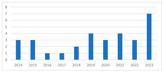 The bibliometric indicators considered correspond to the type of papers, as well as their year of publication. Regarding the articles’ distribution over the years (Figure 1), it is possible to observe, over a 10-year time horizon, a higher concentration (by more than 50%) especially in the last 5 years. This can be explained by considering that the use of VR in workplaces received a significant boost following its adoption as a personnel training method by Walmart. In 2017, Walmart became the first to utilize VR technologies to train managerial skills among its employees, thereby fostering research and opportunities for the application of VR [35].