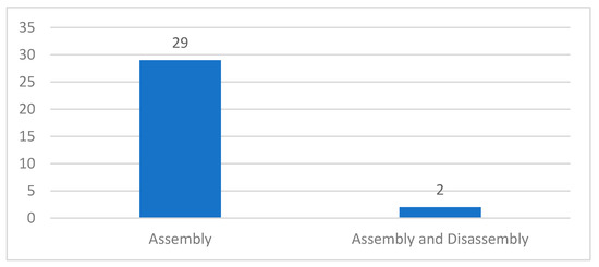 The goal of the research was to identify the effects of using VR on the performance of assembly and disassembly tasks in industrial environments. Compared with the total number of papers selected, there is a clear prevalence of assembly tasks (90%) (Figure 2) with only two papers also focused on disassembly tasks [36,37]. In fact, it is interesting to observe that assembly arouses more interest among researchers than disassembly, which is never studied independently but always in connection with an assembly task. This aspect represents an important gap in the current literature, as discussed later.