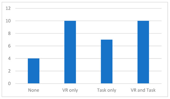 Regarding pre-learning on the task, very often participants were offered the same task, for which all the steps were explained [40,44,56,59,64]. In other cases, the same task was illustrated but simplified, so that the participants were gradually guided to the actual experiment [36,51,52]. In the case of VR, on the other hand, pre-learning had the function of making the participants familiar with the technology. This is particularly useful if the selected subjects have no previous experience with VR. In this way, the possible lengthening of task completion time due to inexperience with the virtual environment is reduced.
