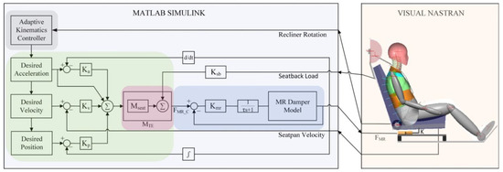 The proposed system in this study measures the instantaneous kinematics of the seat-pan along with the amount of inclination of the seatback during a crash. The system sub-controller, which is called the Adaptive Kinematics Profile Controller (shown by the grey curved box in