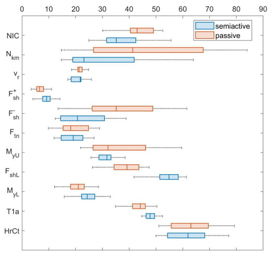 Figure 8 is that both the semiactive and passive seats provide proper protection for whiplash risk since no criterion is above the capping limit in any case. Nevertheless, the semiactive seat shows a superior performance when compared to the passive seat. First, the median values of the critical criteria, such as the negative shear force on the upper neck