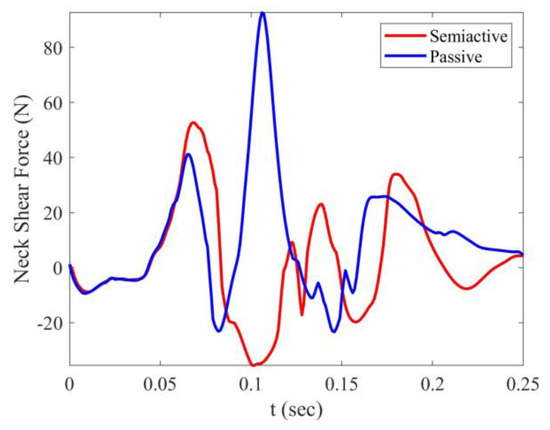 42]. Thus, it is more likely for the semiactive seat to have a lower injury risk in comparison to the injury risk posed by the passive seat for the given crash pulses. This trend of lower duration of the upper-neck shear force is observed for all the other crash pulses in