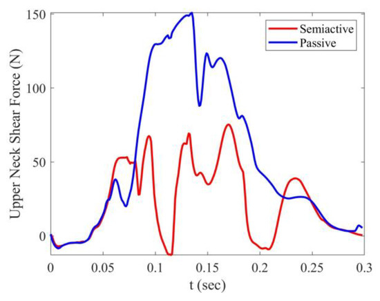 Figure 10, the semiactive seat reduces the maximum upper-neck shear force by 45% (around 40 N) for the medium severity crash pulse SN16 and by 47% (around 70 N) for the high severity crash pulse TR24 in comparison to the results observed for the passive seat. The substantial decline in the maximum values of the upper-neck shear force indicates that the semiactive seat performs well. Furthermore, a detailed examination of these plots reveals that the duration of the sustained shear forces and thus the mean value of the shear forces applied on the upper neck are significantly lower for the occupant seated on the semiactive seat.