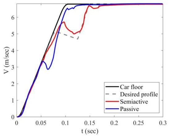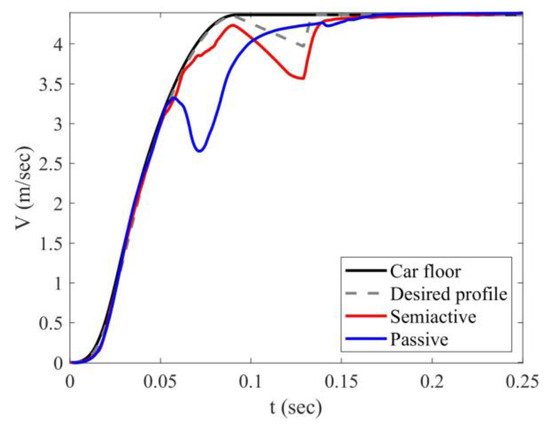 Figure 12, respectively. The velocity profile of the passive seat is also plotted for completeness. It is important to note that the desired velocity profile has no effect on the passive seat velocity profile.