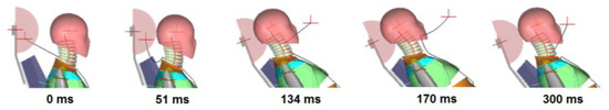 Figure 16, respectively. In these figures, the leftmost frame shows the onset of the impact; the second frame from the left shows the instant when the head touches the head-restraint for the first time (HrCt); the middle frame corresponds to the instant when the head-restraint foam deformation is maximum; the fourth frame from the left shows the instant when the backward rotation of the seatback becomes maximum; in the rightmost frame, the head is about to lose contact with the head restraint when the human body rebounds from the seat.