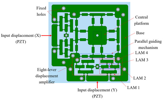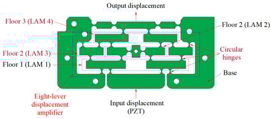 The objective of this study is to develop an innovative vibration-assisted compliant positioner that can be used in the CNC milling process to improve the surface roughness of manufactured parts. Moreover, the utilization of the non-resonant technique is implemented to generate vibrations within the workpiece through the utilization of a stage. The structure is specifically built by using a symmetrical four-lever amplification mechanism (LAM) integrated with right circular hinges according to the highest rotation center accuracy in order to reduce parasitic motion error, as depicted in Figure 1. Specifically, the proposed hybrid displacement amplifier has three floors, including LAM 1 of the first floor, LAM 2 and LAM 3 of the second floor and LAM 4 of the third floor, as illustrated in Figure 1.