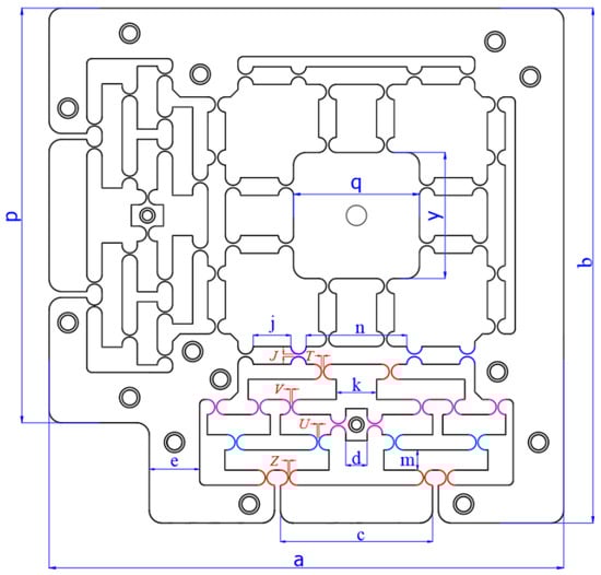The XY positioner has the capability of conducting vibrations either individually or simultaneously through the utilization of two PZT actuators in two perpendicular orientations, as shown in Figure 2. In addition, the XY stage comprises an eight-lever displacement amplification mechanism, a parallel guiding mechanism, and a central platform, as illustrated in Figure 2. More specifically, the parallel guiding mechanism utilizes right circular hinges and rigid joints to decline parasitic motion error and increase the stiffness of the proposed positioner. The main dimensions of the platform are demonstrated in Figure 3. In addition, the key dimension values of the developed positioner with dimension units of mm are illustrated in Table 1. The total dimensions of the suggested positioner were 204 × 204 × 15 (mm).