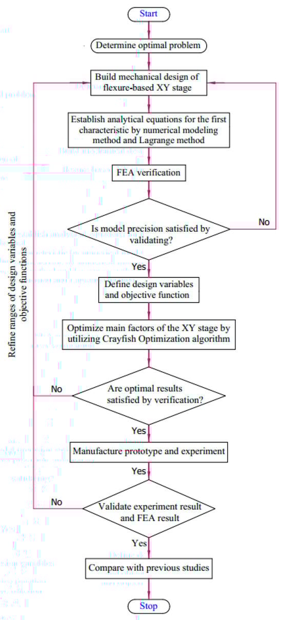 The stage has been constructed to adhere to the eight-lever displacement amplifier, incorporating circular hinges. The dynamic equations of the positioner were obtained through an analytical investigation utilizing the PRBM and Lagrange methods. Subsequently, based on the theoretical equations, the Crayfish optimization technique was utilized to optimize the crucial variables of the produced positioner to improve the stage’s quality response. More details about the Crayfish optimization algorithm can be read in the ref. []. Figure 4 depicts the flowchart of the suggested optimal strategy for the developed positioner. The following is a concise summary of the proposed hybrid approach.