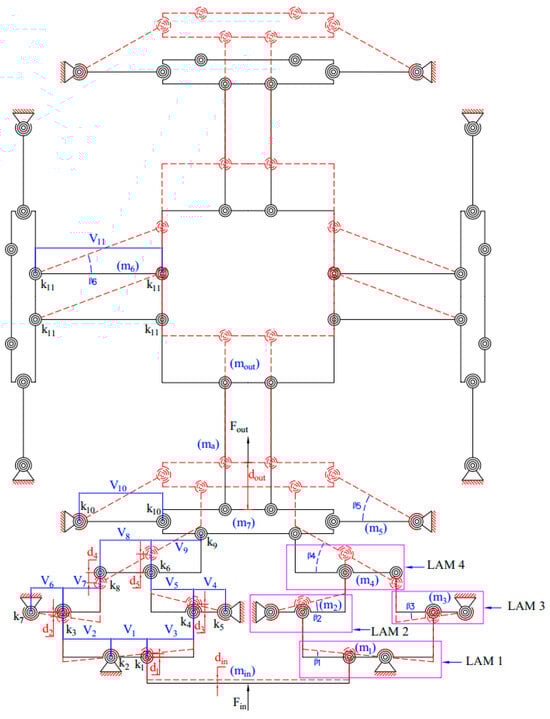 The input and output displacements of the displacement amplifier are denoted as din and dout, correspondingly, as depicted in Figure 2 and Figure 5. The input displacement of the second floor, as well as the third floor, is equivalent to the output displacement of the first floor. Furthermore, the output of the second and third floors serves as the input displacement for the fourth floor. The stage’s dynamic equation is derived from a series of equations.