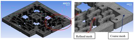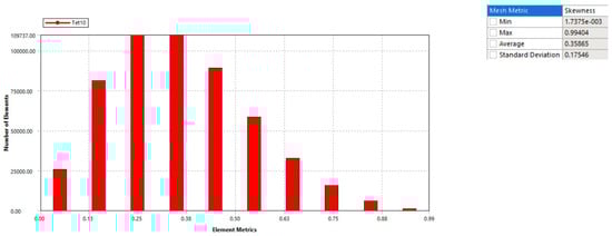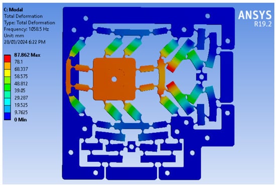 The validity of the theoretical findings was confirmed through the utilization of FEA analysis. The natural frequency, as per the theory, was determined to be 990.74 Hz. Initially, the stage’s 3D model was built using a rough mesh. Next, in order to improve the accuracy of the calculations, the mesh of the model was purified at the specific points where the circular hinges were located, as seen in Figure 7. Later, the Skewness criteria were employed to evaluate the mesh’s quality. More details about mathematical equations to evaluate the mesh quality for different mesh element kinds based on the Skewness criteria can be read in the ref. []. The attained consequence of a moderate worth based on this benchmark was 0.35865, as depicted in Figure 8. This value ensured the achievement of an exemplary mesh for the simulated procedure of the developed stage. The result obtained by using the Finite Element Method (FEM) showed that the first resonant frequency was calculated to be at 1058.5 Hz, as depicted in Figure 9.