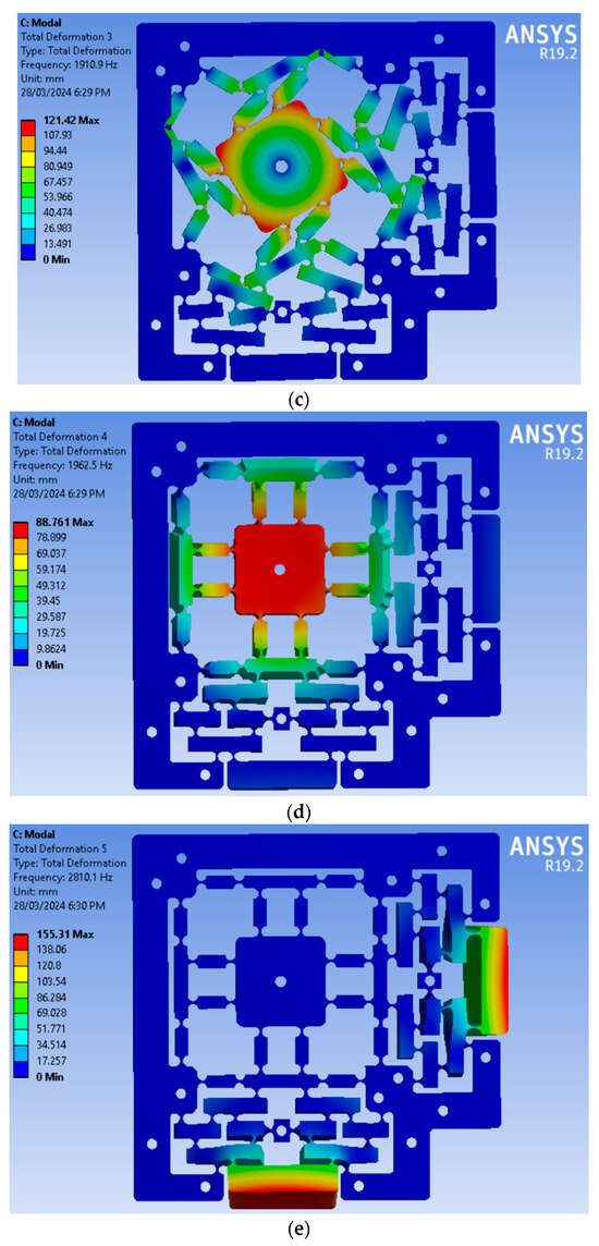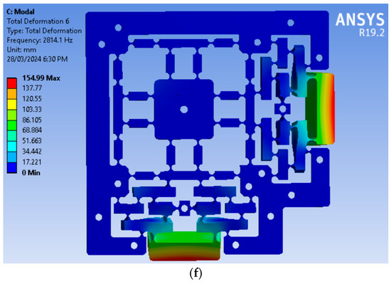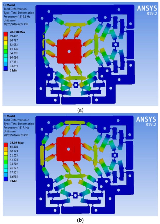 The optimal outcome was confirmed using the FEM method. The optimal parameters were specifically employed to construct a 3D model for the purpose of verifying the optimal outcome. The obtained results indicated that the first resonant frequency, as determined by the FEA analysis, was 1216.6 Hz, as depicted in Figure 10a. Additionally, an inaccuracy between the optimal consequence and the FEA consequence was 1.32%, as exhibited in Table 3. Furthermore, based on optimal results, the frequency values of the stage obtained from the first natural modes using the FEM method were determined to be at 1216.6 Hz, 1217 Hz, 1910.9 Hz, 1962.5 Hz, 2810.1 Hz, and 2814.1 Hz, respectively, as depicted in Figure 10a–f. In addition, based on FEA results, the workspace of the structure probed in the X and Y directions with a safety factor of higher than 1.8 was 35.096 × 35.188 (µm).