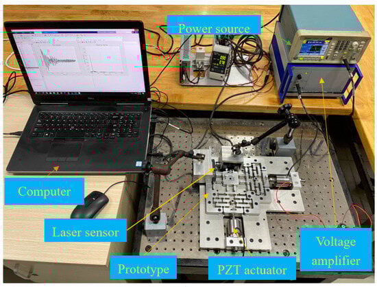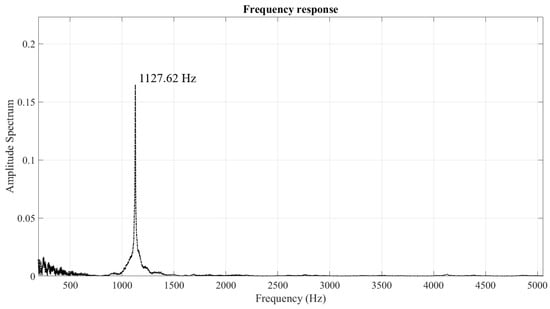 The configuration of the experiment, as depicted in Figure 11, was designed to assess the analytical and simulated calculations of the dynamic characteristic of the structure. The LK-G30 laser displacement sensor, manufactured by Keyence (Osaka, Japan), accurately measured the vibration of the center stage in the X and Y directions with a precision of 0.05 μm. The first resonant frequency of the stage was determined using the hammer test method, which involved analyzing the recorded data from a laser sensor LK-G30. The laser displacement sensor was controlled by software. Subsequently, the collected data were subjected to analysis via the rapid Fourier transform algorithm implemented in the Matlab software R2021b. The experimental result was depicted in Figure 12, and the initial crest of the frequency spectrum was observed at 1127.62 Hz. Furthermore, the obtained outcome demonstrated a 7.31% disparity between the FEA outcome and the experimental outcome, as given in Table 4. Consequently, the error was minor and closely aligned with the FEA outcome.