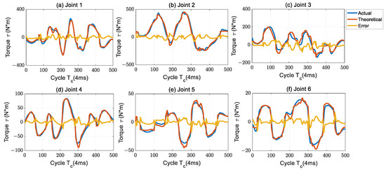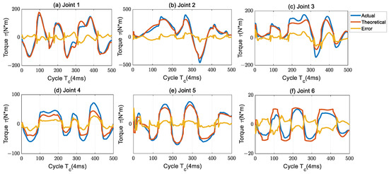 The parameters of Table 2 are brought into the dynamic formula, and the friction of the joint is calculated according to the friction parameters in Table 3. The actual output torque of each joint and the theoretical torque based on the identified parameters are plotted as shown in Figure 2. Compared with Figure 1, it can be seen that the peak protrusion of the theoretical and actual torque is significantly reduced when the velocity direction changes, and the accuracy in the uniform velocity section is significantly improved, especially the torque errors of joints 3, 4, and 6 are improved significantly.