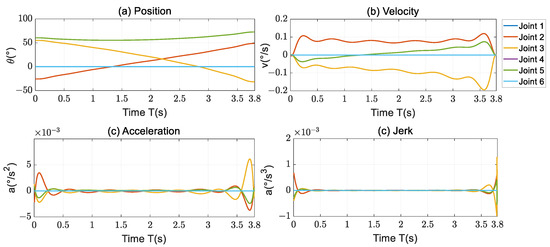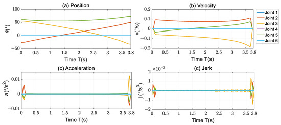 After optimization, the start and stop points of the position curve of each joint are the same as those of the original curve, and the running time is the same. From Equation (21), it can be seen that there is a maximum error of 0.5 mm between the trajectory and the original trajectory during the process, which ensures the consistency of the running trajectory. The acceleration amplitude of joint 2 and joint 3 in the stop phase is about 0.5 times that of the original trajectory, and the jerk amplitude is basically the same as that of the original trajectory.