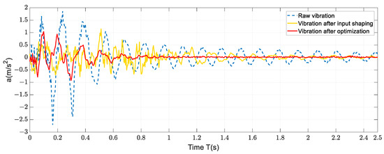 As can be seen from the figure, the maximum amplitude of the original vibration acceleration curve is 2.71, and the amplitude converges to less than 0.3 after 1.58 s. After optimization, the maximum amplitude of the curve is 1.04, the amplitude converges to less than 0.3 after 0.46 s, the vibration stops completely at 0.7 s, the maximum amplitude decreases by 61.62%, and the vibration duration decreases by 70.89%. The input shaping vibration curve has a significant delay compared with the original curve with the maximum amplitude of 1.15 at 0.51 s. The maximum amplitude converges to within 0.3 after 0.69 s, but there is still a small vibration after that. The amplitude converges to within 0.1 at 1.64 s. From the above analysis, it can be seen that compared with the input shaping method, the proposed method can reduce the residual vibration more effectively.