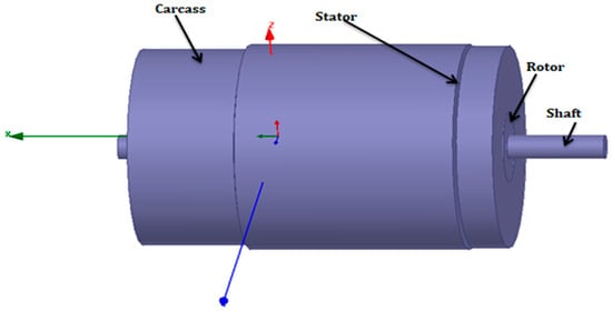 To study the influence of electrical machine components on electromagnetic propagation, modeling the electrical machine is essential. This requires knowledge of its structure and the specifications of its materials and geometric characteristics [,]. The HFSS modeling must consider the same material specifications and geometric characteristics used with Maxwell 2D [].