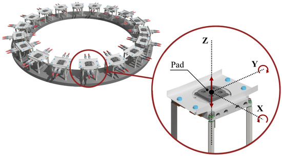 One way to achieve higher precision is creating parts, such as a pad and slider, separately in substantial proportions. While this approach enhances the precision of the sliding surfaces and facilitates transportation, it introduces a new challenge of aligning the separate pads, what is in the literature [6,20] known as a multi-pad bearing (Figure 1). In the case of large bearings, it is necessary to ensure that the bearing pads are accurately aligned [21]. Incorrect positioning of the sliding surfaces can result in a failure of the lubricating film thickness or a direct collision of the sliding surfaces [22,23].